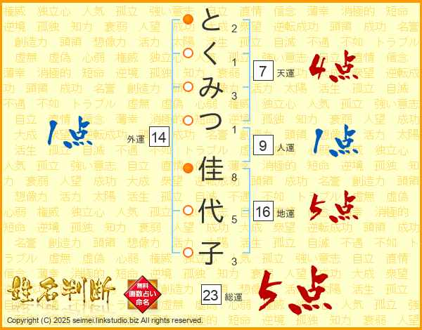 と(2画)く(1画)み(3画)つ(1画) 佳(8画)代(5画)子(3画)