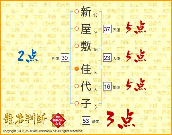 新(13画)屋(9画)敷(15画) 佳(8画)代(5画)子(3画)