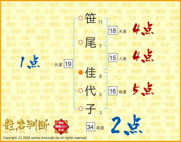 笹(11画)尾(7画) 佳(8画)代(5画)子(3画)
