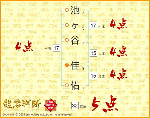 池ヶ谷佳佑さんの総運は32画の5点!