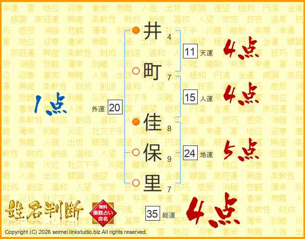 井(4画)町(7画) 佳(8画)保(9画)里(7画)