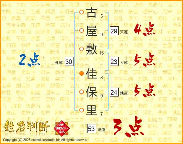 古(5画)屋(9画)敷(15画) 佳(8画)保(9画)里(7画)