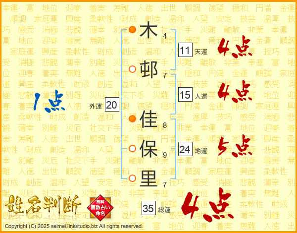 木(4画)邨(7画) 佳(8画)保(9画)里(7画)