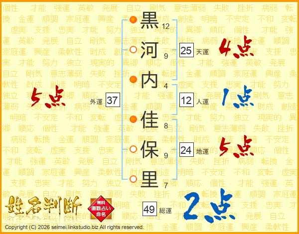 黒(12画)河(9画)内(4画) 佳(8画)保(9画)里(7画)