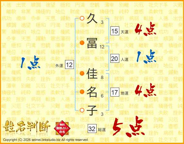 久(3画)冨(12画) 佳(8画)名(6画)子(3画)