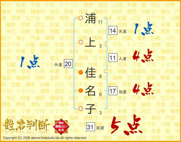 浦上佳名子さんの総運は31画の5点!