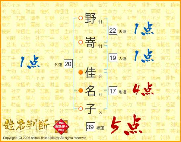 野嵜佳名子さんの総運は39画の5点!