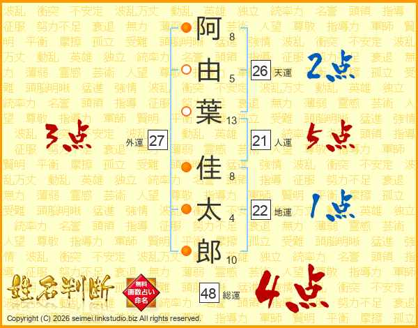 阿(8画)由(5画)葉(13画) 佳(8画)太(4画)郎(10画)