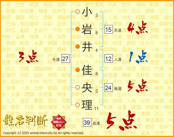 小(3画)岩(8画)井(4画) 佳(8画)央(5画)理(11画)