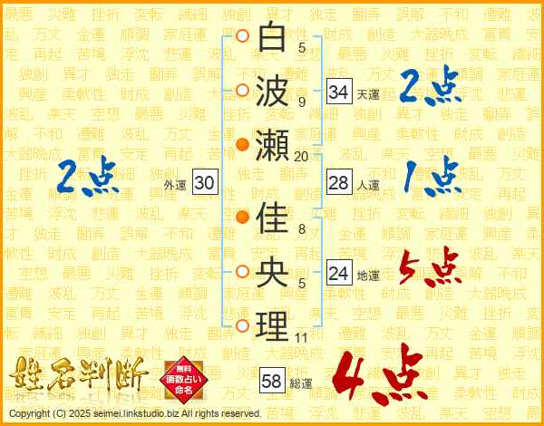 白(5画)波(9画)瀬(20画) 佳(8画)央(5画)理(11画)