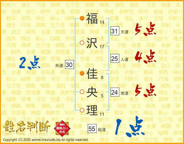 福(14画)沢(17画) 佳(8画)央(5画)理(11画)