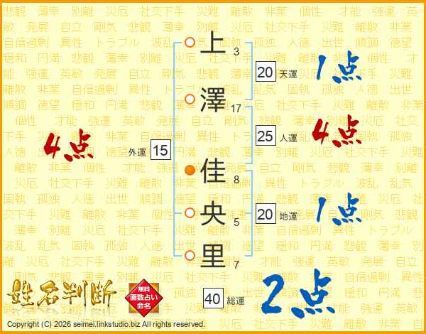 上(3画)澤(17画) 佳(8画)央(5画)里(7画)