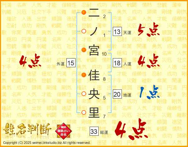 二(2画)ノ(1画)宮(10画) 佳(8画)央(5画)里(7画)