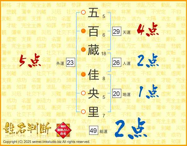 五(5画)百(6画)蔵(18画) 佳(8画)央(5画)里(7画)