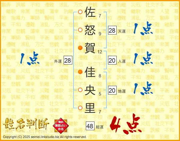 佐(7画)怒(9画)賀(12画) 佳(8画)央(5画)里(7画)