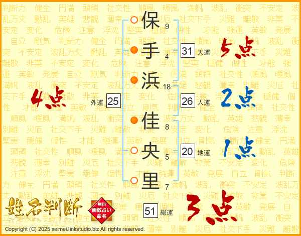 保(9画)手(4画)浜(18画) 佳(8画)央(5画)里(7画)