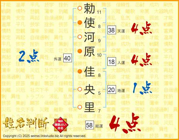 勅(11画)使(8画)河(9画)原(10画) 佳(8画)央(5画)里(7画)