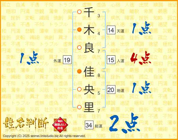 千(3画)木(4画)良(7画) 佳(8画)央(5画)里(7画)