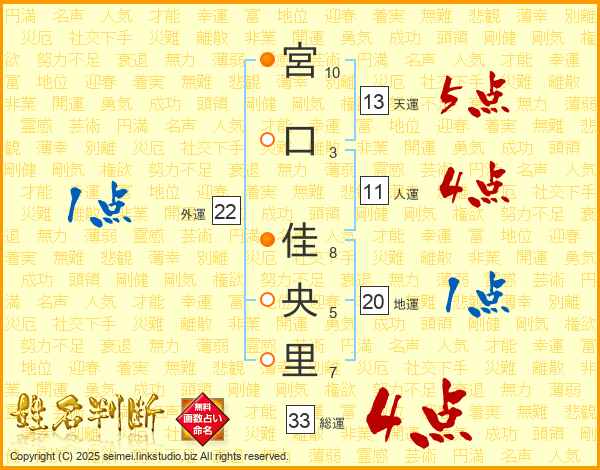 宮(10画)口(3画) 佳(8画)央(5画)里(7画)