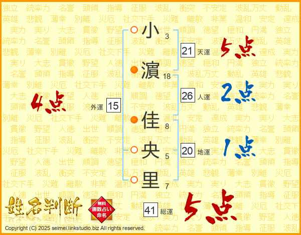 小(3画)濵(18画) 佳(8画)央(5画)里(7画)
