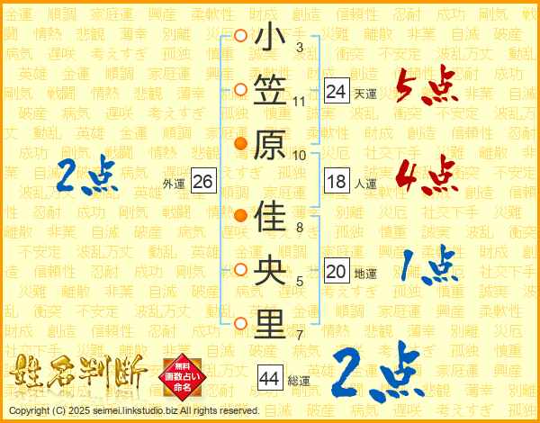 小(3画)笠(11画)原(10画) 佳(8画)央(5画)里(7画)