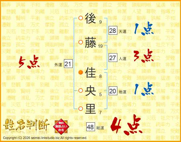 後(9画)藤(19画) 佳(8画)央(5画)里(7画)