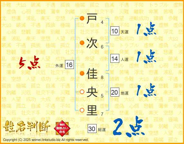 戸(4画)次(6画) 佳(8画)央(5画)里(7画)