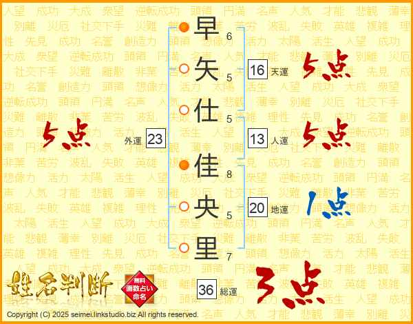 早(6画)矢(5画)仕(5画) 佳(8画)央(5画)里(7画)
