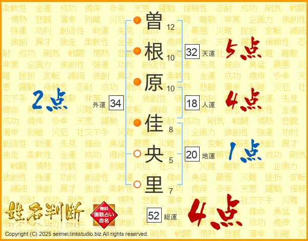 曽(12画)根(10画)原(10画) 佳(8画)央(5画)里(7画)