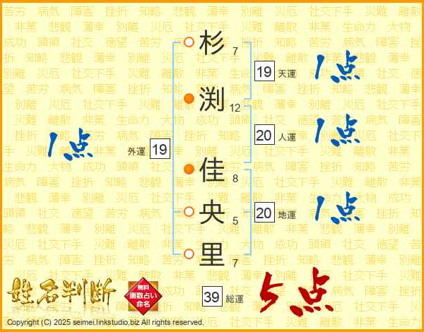 杉(7画)渕(12画) 佳(8画)央(5画)里(7画)