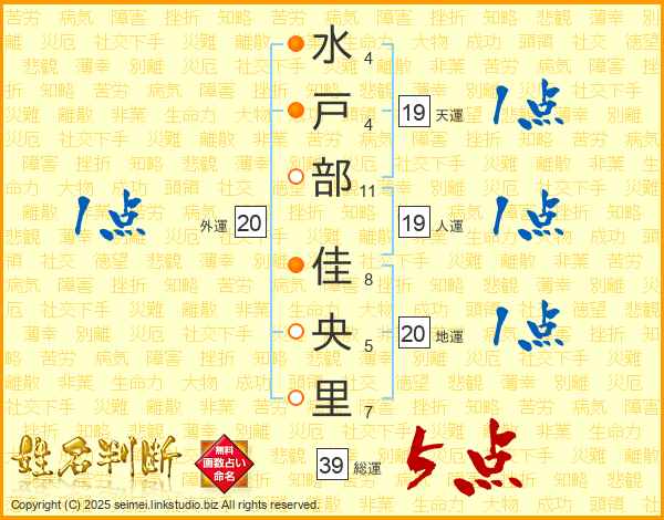 水(4画)戸(4画)部(11画) 佳(8画)央(5画)里(7画)
