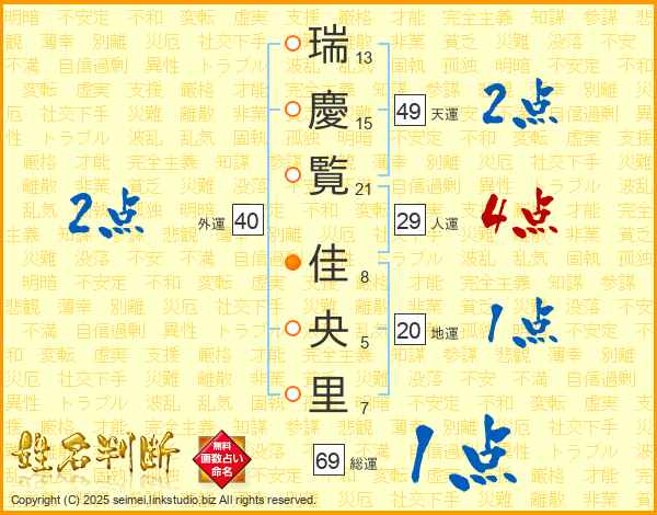 瑞(13画)慶(15画)覧(21画) 佳(8画)央(5画)里(7画)