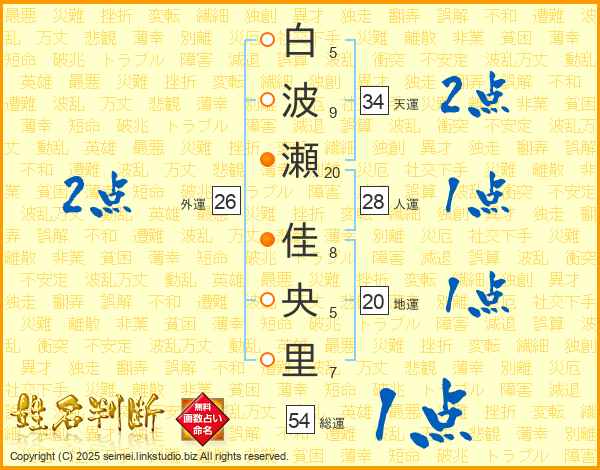 白(5画)波(9画)瀬(20画) 佳(8画)央(5画)里(7画)