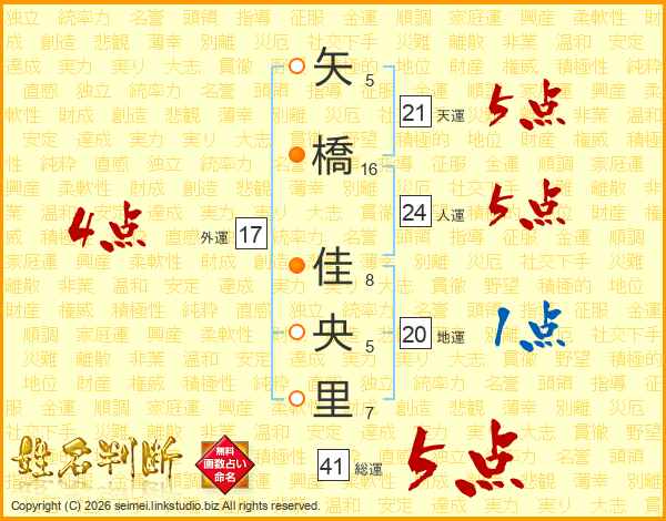 矢橋佳央里さんの総運は41画の5点!