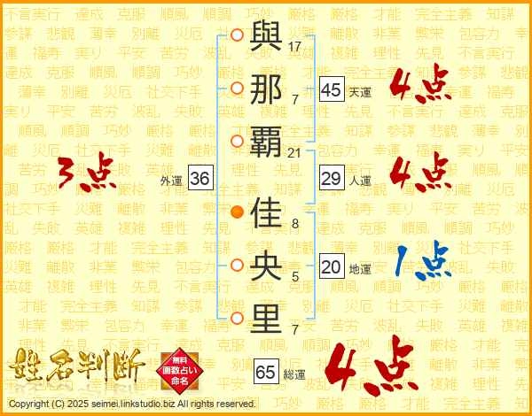 與(17画)那(7画)覇(21画) 佳(8画)央(5画)里(7画)