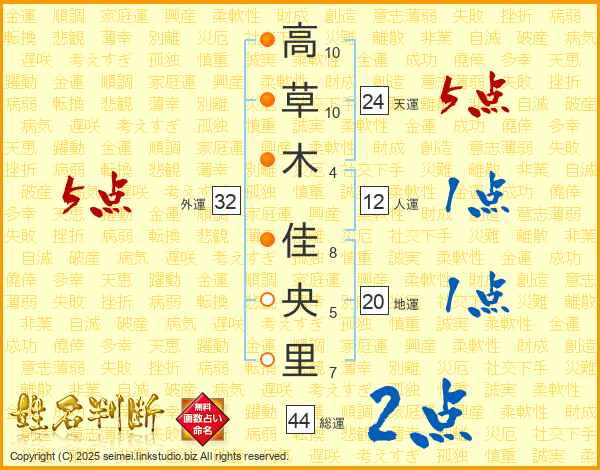高(10画)草(10画)木(4画) 佳(8画)央(5画)里(7画)