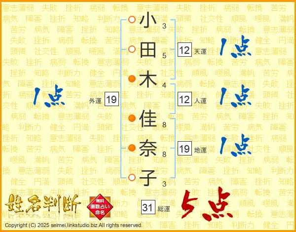 小(3画)田(5画)木(4画) 佳(8画)奈(8画)子(3画)