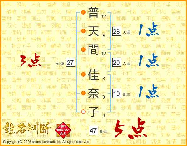 普(12画)天(4画)間(12画) 佳(8画)奈(8画)子(3画)