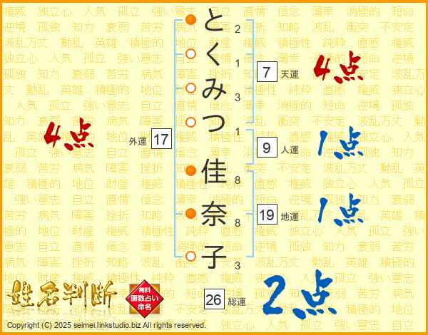 と(2画)く(1画)み(3画)つ(1画) 佳(8画)奈(8画)子(3画)