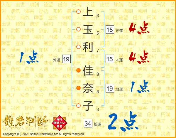 上(3画)玉(5画)利(7画) 佳(8画)奈(8画)子(3画)