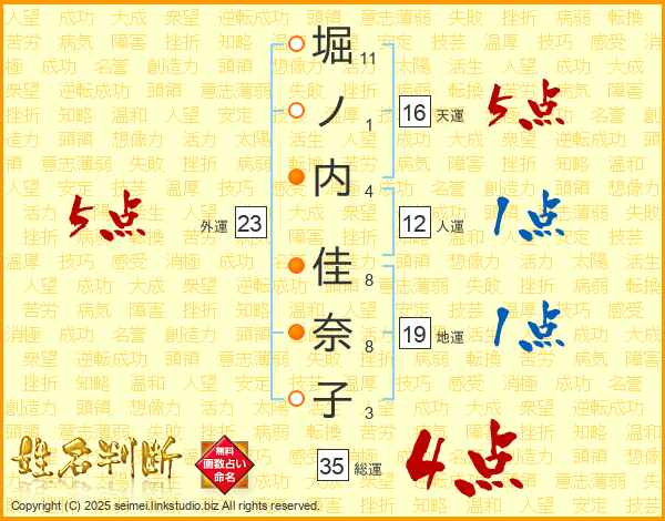 堀(11画)ノ(1画)内(4画) 佳(8画)奈(8画)子(3画)