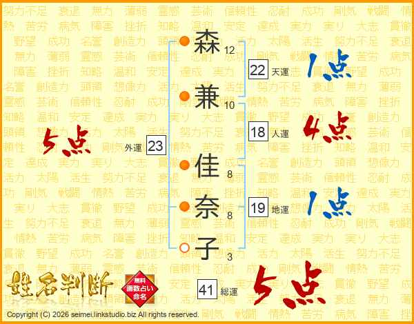 森(12画)兼(10画) 佳(8画)奈(8画)子(3画)