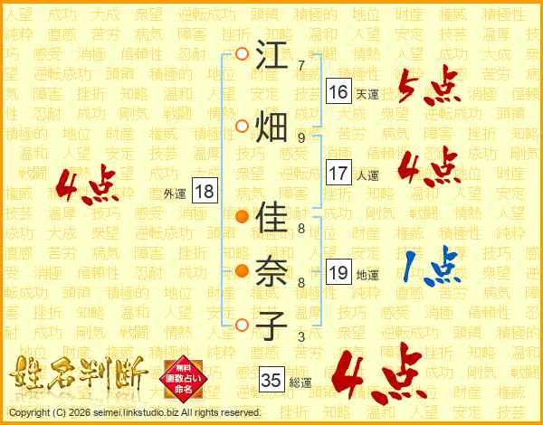 江(7画)畑(9画) 佳(8画)奈(8画)子(3画)