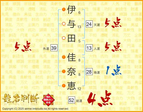 伊(6画)与(13画)田(5画) 佳(8画)奈(8画)恵(12画)
