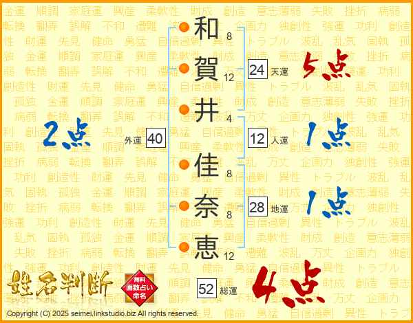 和(8画)賀(12画)井(4画) 佳(8画)奈(8画)恵(12画)