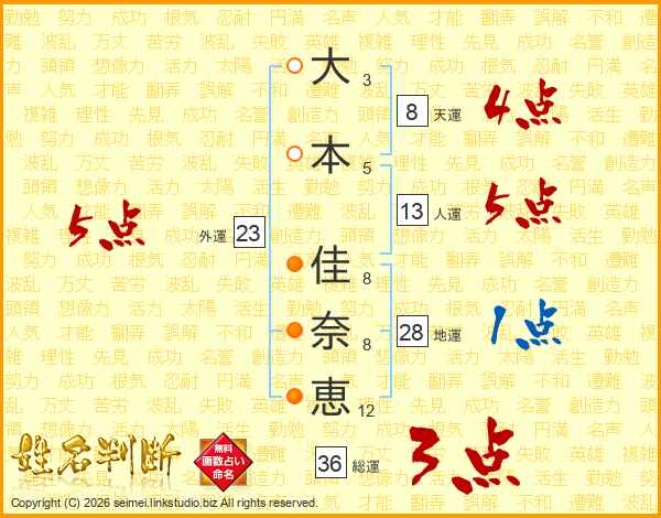 大(3画)本(5画) 佳(8画)奈(8画)恵(12画)