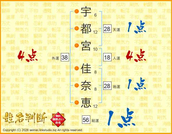 宇(6画)都(12画)宮(10画) 佳(8画)奈(8画)恵(12画)
