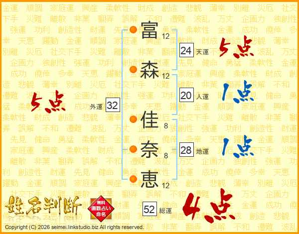 富(12画)森(12画) 佳(8画)奈(8画)恵(12画)