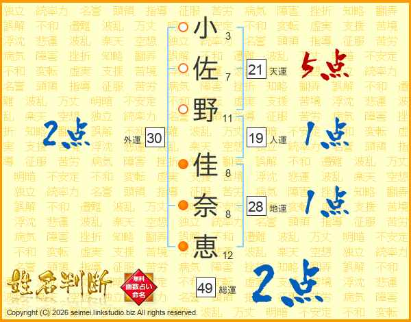 小(3画)佐(7画)野(11画) 佳(8画)奈(8画)恵(12画)