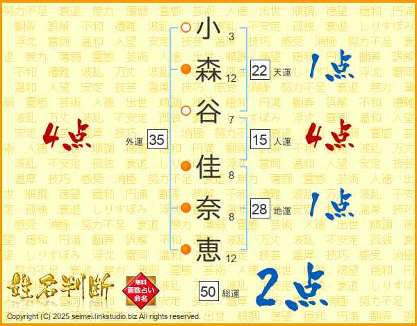 小(3画)森(12画)谷(7画) 佳(8画)奈(8画)恵(12画)